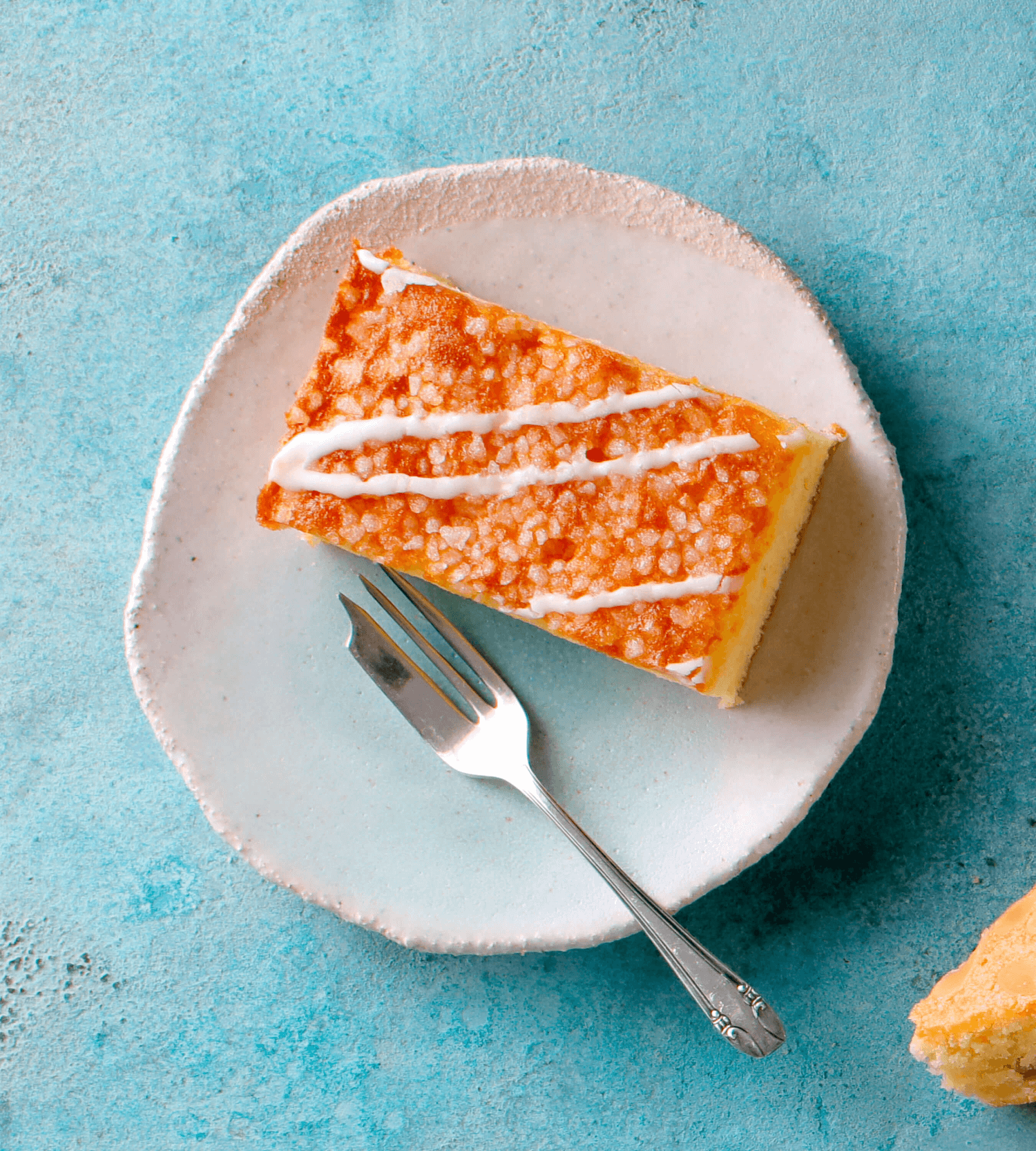 An all butter sponge with lemon oil and lemon curd, infused with a lemon syrup and finished with crunchy nibbed sugar and a drizzled lemon icing.