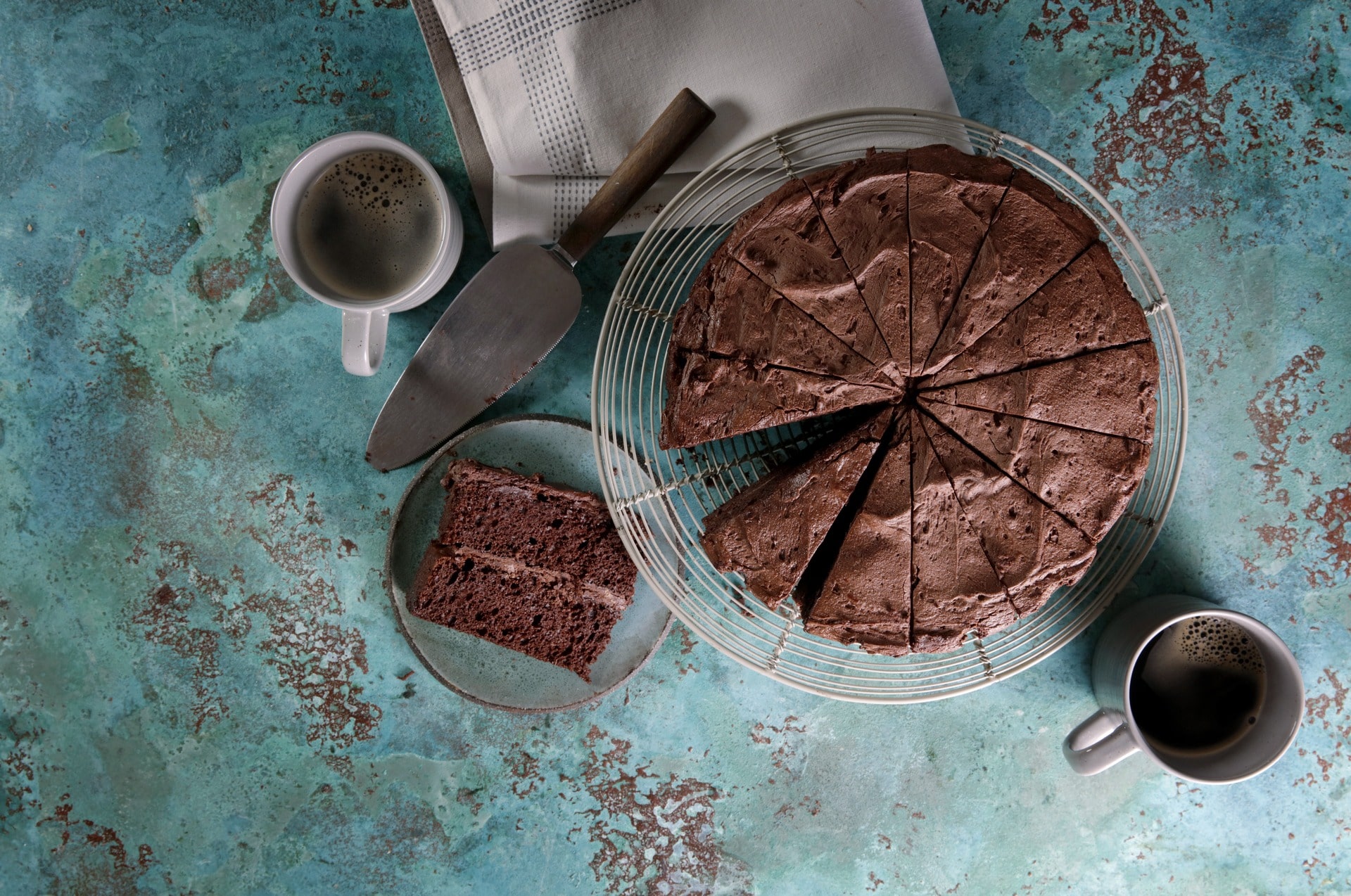 A light, gluten-free sponge, filled with a layer of chocolate fudge icing and chocolate chips, topped with more chocolate fudge icing.