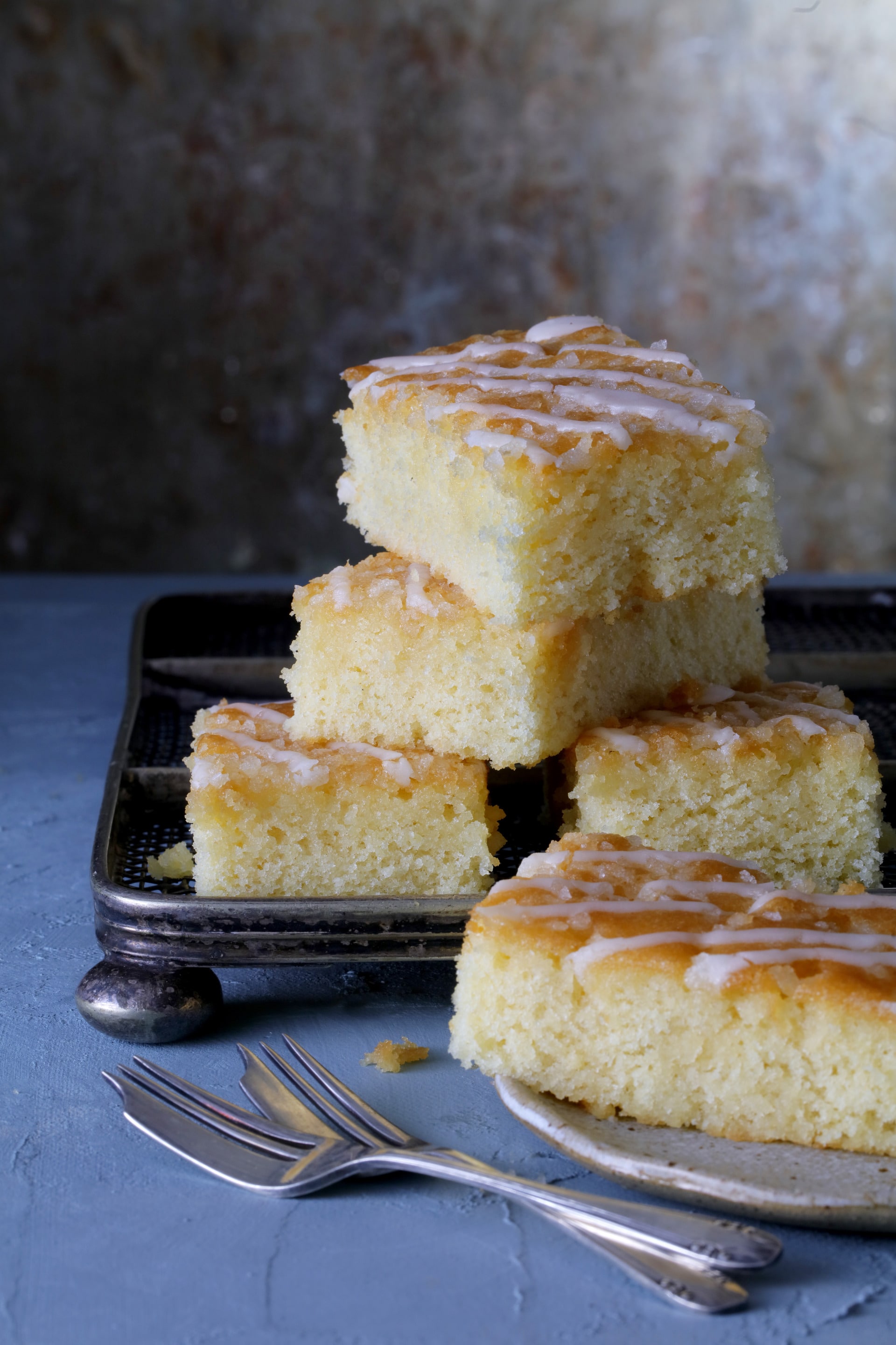 An all butter sponge with lemon oil and lemon curd, infused with a lemon syrup and finished with crunchy nibbed sugar and a drizzled lemon icing.